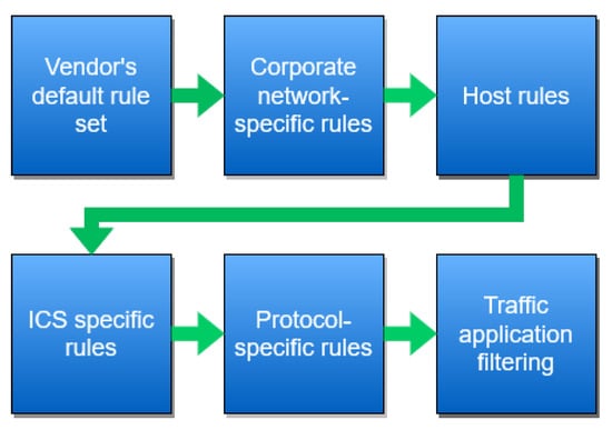 Since IT-OT convergence is a relatively new phenomenon, many Operational Technologies are still insecure by design [4]. IT technologies have evolved alongside the various threats to networking and computing technologies while OT networks were isolated until relatively recently. In [26], CISA recommends various traditional methods to implement a defense-in-depth strategy at the enterprise zone. This differs compared to traditional IT security services, shown in CISA’s recommended firewall rule set layer, depicted in Figure 2. In particular, they recommend the use of a DMZ to provide logical separation of the enterprise zone from the Internet; virtual private networks to secure remote access connections; firewalls to restrict connections to trusted entities and content between zones; and various host security controls such as antivirus software, patch management, intrusion detection systems, etc.