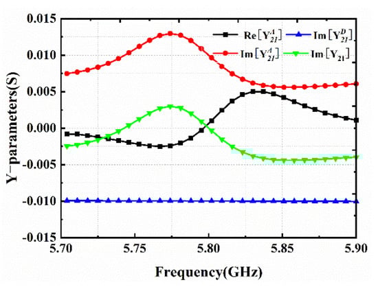Figure 3 shows the relevant Y parameters for (3) and (4). It is clearly seen that at 5.8 GHz, the real part of is close to 0, and the imaginary part is offset from the imaginary part of . Therefore, according to the simulation in CST, it can be determined that the meander line can effectively decouple the 1 × 2 RAA at a length of 33.2 mm and a width of 0.41 mm.
