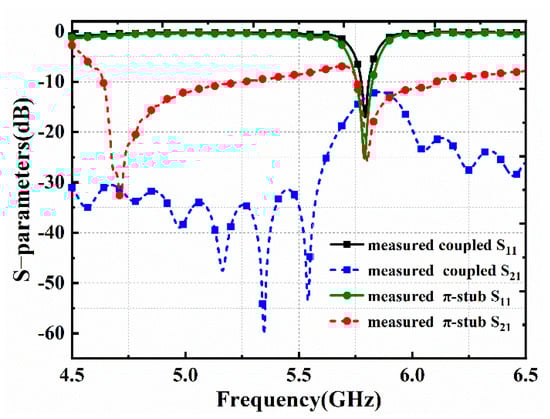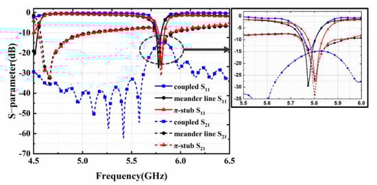 The related simulation results are shown in Figure 4. It can be seen that the original RAA coupling coefficient at 5.8 GHz is −15.1 dB. The mutual coupling decreases by 10.5 dB when the meander line takes effect, while the mutual coupling decreases by 16.7 dB when the π-stub decoupling network is added, and S11 decreases from −11 dB to −27 dB.