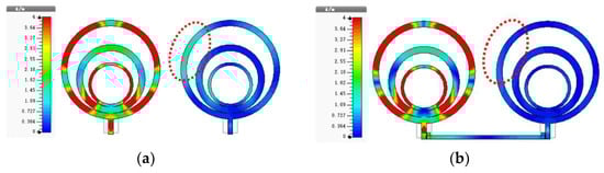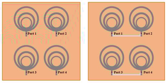 Moreover, the decoupling effect of the π-stub network can be understood by the surface current distribution. When port 1 is excited, the coupled element is strongly influenced, but it is obvious that the coupled current is greatly weakened after loading the π-stub decoupling network, as shown in Figure 5.