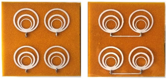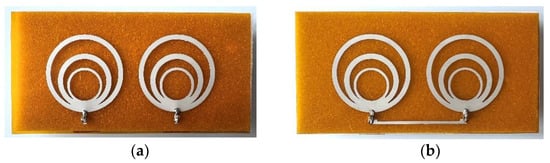 In order to demonstrate the effect of the π-stub decoupling network, a pair of 5.8 GHz RAAs were designed, simulated, and measured. The 1 × 2 RAA resonated at 5.8 GHz and was designed on a polyimide with a thickness of 0.1 mm (εr = 3.5, tan σ = 0.002), and a 1 mm air gap was set for better impedance matching. The edge-to-edge distance of the antenna was 6 mm (0.11 λ0). The antenna geometry and parameters are shown in Figure 2 and Table 2.