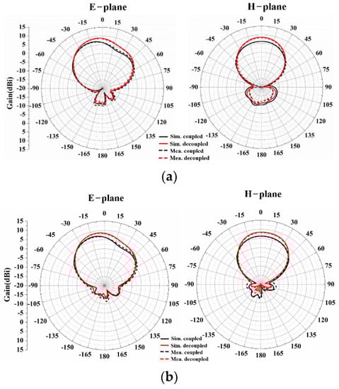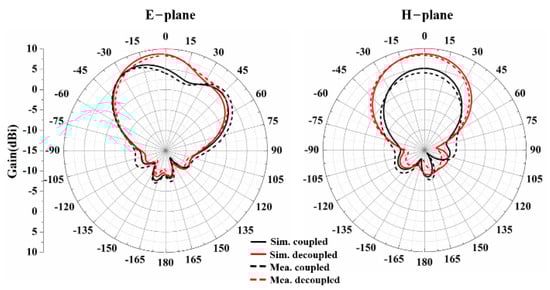 According to Figure 9, it can be clearly seen that, before decoupling, the radiation patterns are seriously distorted because the coupled current excites the radiation of other patches, leading to poor directionality and gain reduction. This has very negative effects on the receiving power. However, the antenna’s directionality and gain are greatly improved after loading the π-stub. Specifically, port 1 has a maximum measured gain of 5.5 dBi when coupled and 8.3 dBi when decoupled, showing that the π-stub is effective in decoupling the 1 × 2 RAA.