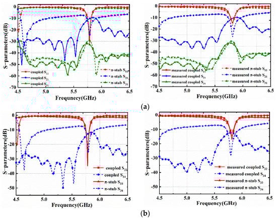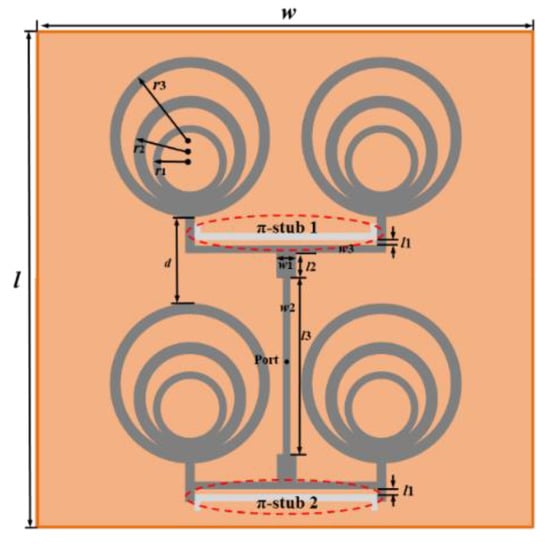 Considering that the π-stub decoupling network can provide a wider decoupling bandwidth, it is highly suitable for RAAs [24]. As shown in Figure 1a, the proposed π-stub decoupling network is connected in parallel with the coupled antenna network.