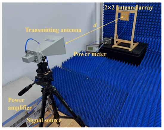 In the experiment, a 5.8 GHz signal was generated by a signal source and amplified by a power amplifier. The transmitting antenna was a 5.8 GHz horn with a gain of 16 dBi. The input power of the transmitting antenna was 2 W, and the 2 × 2 RAA was placed at different positions (within the near-field range) to measure its receiving power. The geometric centers of the transmitting and receiving antennas were always aligned. The measured results are shown in Figure 14.