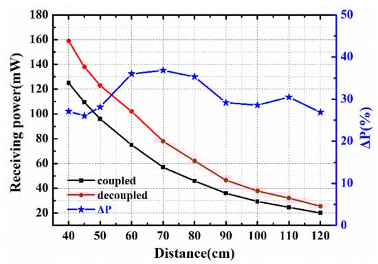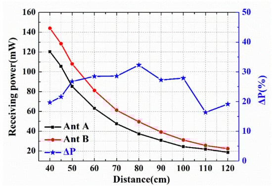 The improvement in receiving power is denoted by ΔP, where is the measured power when the antenna array adds the proposed π-stub, and is the measured power when there is no π-stub in the antenna array. Obviously, in the range from 40 cm to 120 cm, the addition of the π-stub leads to a maximum enhancement of 36.4% of receiving power. The measured results are reduced when the RAA approaches the far-field region, which is mainly due to the power loss in free space. It is noteworthy that the improvement was maintained at more than 27% in the entire range.