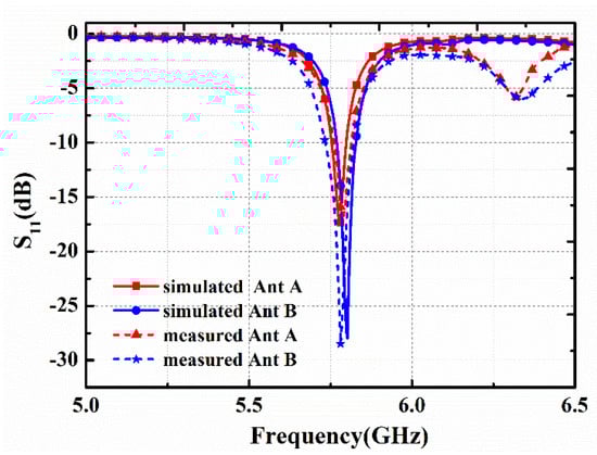 The prototypes were made and measured. Ant. A is the original RAA, and Ant. B has an added π-stub, as shown in Figure 16. According to the results in Figure 17, S11 of Ant. A and Ant. B at 5.8 GHz is −12.3 dB and −21.8 dB, respectively, indicating that Ant. B has better impedance matching. For the RAA, less power is reflected to free space.