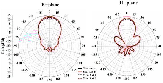 Then, the radiation patterns were also simulated and measured, as shown in Figure 18. The results show that the radiation patterns of Ant. A and Ant. B do not produce undesirable deformation, while the gain of Ant. B is higher than that of Ant. A. The gains of Ant. A and B are 11.6 and 13 dBi, respectively. Obviously, the addition of the π-stub improves the impedance matching of the RAA and increases the gain. To further validate the results, Ant. A and Ant. B were measured using the MWPT experimental system.