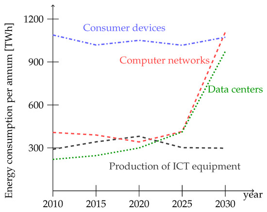 It clearly follows from Figure 1 that the amount of energy consumed by communications, i.e., data networks, has increased faster than other ICT areas. Figure 2 shows that by 2030, the energy consumed by networks is estimated to constitute almost half (45%) of all energy consumed by ICT including the production of ICT devices. This is not surprising since consumer devices seem to achieve full functionality only when connected to the network. At the same time, in addition to computing devices, such as desktops, laptops, and tablets, consumer devices include smartphones, TV sets, household appliances, industrial sensors, etc. The concept of the Internet of Things (IoT) has significantly increased the load of data networks. The relationship between the performance of IoT applications and energy costs is analyzed in [31]. Other related areas where a lot of effort has been spent on improving energy efficiency are cloud computing [32] and edge computing [33]. An extensive analysis of the possible reduction of energy consumption in computer networks was provided in [5].