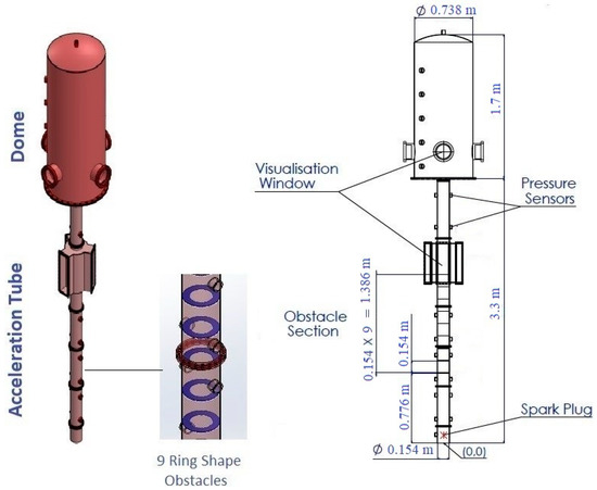In the present study, the ENACCEF facility situated in Orleans, France was studied [17]. The vertical vessel was 5 m in length and consisted of two parts: an acceleration tube with 0.154 m inner diameter and 3.3 m length, and a dome region with 0.738 inner diameter and 1.7 m length. There were nine annular obstacles in the acceleration tube, creating a blockage ratio of 63%. The blockage ratio is defined as BR = 1 − (d/D)2, in which D and d are the inner diameters of the acceleration tube and obstacle, respectively. The first obstacle was set 0.776 m from the tube, and expected to play an essential role in a clean-transport future bottom (point (0,0)), as shown in Figure 1. The distance between each subsequent obstacle was 0.154 m, and their width was 2 mm. The full schematic of the ENACCEF facility is illustrated in Figure 1. This combustion chamber was used to investigate the impact of hydrogen concentration in a hydrogen–air mixture on DDT and detonation diffraction mechanisms. Three hydrogen concentrations of 13%, 20%, and 30% were used to run the simulations.
