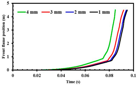 Figure 3 depicts the flame front position with respect to time in the H2–air mixture with 13% hydrogen concentration and BR = 0.63. The flame front position is explained as the maximum vertical distance between the flame tip and the ignition point. This figure shows the mesh sensitivity analysis for the flame front position. In Figure 3, the slope of the flame front position changed near the first obstacle, about 0.6 m from the ignition point, and the slope further increased, which demonstrates that the obstacles offered a further increase in the velocity of the flame. The flame accelerated toward the dome and reached the end of it at about t = 0.9 s.
