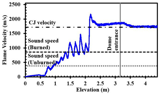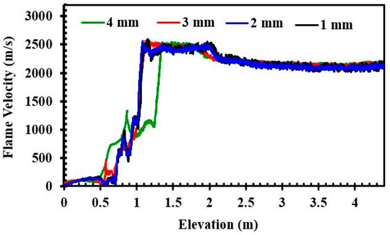 Figure 4 indicates the relationship between the flame velocity and the elevation from the ignition point for the H2–air mixture with 30% hydrogen concentration and BR = 0.63. The speed of the flame was derived from the flame tip position. This figure shows the mesh sensitivity analysis for the flame velocity. In Figure 4, when x < 1 m, the velocity of the flame propagation showed an alternative “deceleration–acceleration” and an escalating trend of oscillation owing to the interaction between the flame, the obstacles, and the compression wave. At x = 1 m, an unexpected jump in flame speed was noticed, which is defined as the DDT. The maximum value of flame velocity was approximately 2500 m/s. Then, crossing the obstacle, the flame velocity declined and eventually stabilized at almost 2100 m/s.