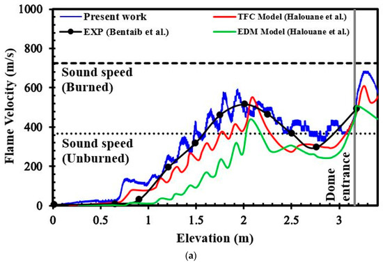 To validate the current numerical results, Figure 5a compares the experimental results of Bentaib et al. [17] and the numerical results of Halouane et al. [39] with the present numerical results. In this figure, the flame velocity and elevation from the ignition point are shown in the H2–air mixture with 13% hydrogen concentration and BR = 0.63. According to the analysis of the experimental results, flame propagation in this chamber was divided into four parts: (1) the quasi-laminar flame (before reaching the obstructed part of the tube), (2) the accelerating flame (in the obstructed part of the tube), (3) the deceleration flame, (4) the flame jet occurring in the dome.