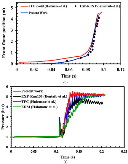 Figure 5b,c indicate a comparison between the current simulation results, the experimental results of Bentaib et al. [17], and the numerical results of Halouane et al. [39] in the H2–air mixture with 13% hydrogen concentration. Accordingly, the simulation outcomes are well matched with the data obtained experimentally. In Figure 5b, to make the comparison with the empirical data more straightforward, 20 ms was added to the time coordination of all the outputs obtained numerically. The key reason behind this time difference is in the ignition of the flame. In the experiment, the spark plug ignited only a very small volume of the mixture; therefore, there was a time lag before the starting time of flame propagation. Adding time to the numerical results was also undertaken by Kirkpatrick et al. [63]. The primary experiments showed that these differences were not essential points for the subsequent flame propagation. In Figure 5c, the pressure curve is adjusted by shifting time in order to allow a better comparison between simulation and experiments. Adding time to the numerical results in the pressure curves was also undertaken by Halouane et al. [39]. In this figure, the differences between the experimental and numerical results may arise from the heat losses as well as from radiation influences, which are not considered in this simulation.