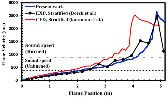 The flame velocity in the stratified H2–air mixture with 22.5% hydrogen concentration, along with the experimental results of Boeck et al. [64] and the numerical results of Karanam et al. [65].