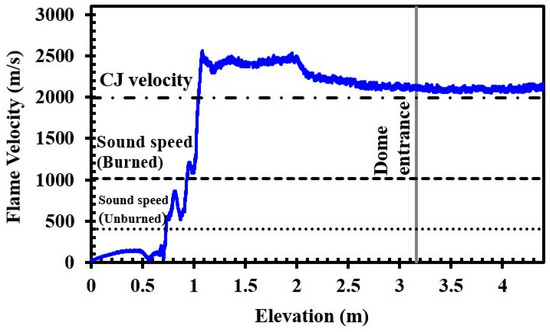 Shamsadin Saeid et al. [24,60] also studied detonation using the ddtFoam solver in a rectangular channel with obstacles, and compared it with the experimental results of Ettner et al. [43] and Boeck et al. [67]. They showed that the solver has acceptable potential to study DDT. It should be noted that this is the first time that detonation has been studied in the ENACCEF facility. Figure 8 shows the flame speed for the H2–air mixture with 20% hydrogen concentration and a blockage ratio of 0.63. As can be observed, the flame velocity fluctuates in the obstructed part of the tube due to the flame transporting through the obstacles. The flame speed rises while crossing the obstacle owing to the reduction in tube cross-section and increase in turbulence level. Then, crossing the obstacle, the flow decreases because of the abrupt flame expansion in the transverse direction and the rise in the cross-sectional area of the flow. Intense interactions between the propagating flame and the turbulent flow led the flame velocity to reach the sound speed of the unburned products and to transition from a slow to a fast deflagration and, eventually, to the choked flame. In this situation, owing to the interaction between the flame and the shock waves, the flame accelerated. Under these conditions, an unexpected jump in the velocity of the flame was seen, which is defined as DDT. Subsequently, the created detonation moved along the acceleration tube and entered the dome. Upon entering the dome, the detonation weakened, and local detonation damping was observed. This is associated with the effects of expansion waves and increased curvature. Furthermore, it was found that there was no total damping on detonation and, hence, the detonation was successfully released in a larger diameter tube at CJ speed.