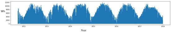 The dataset originally contained seven CSV files regarding different photovoltaic panels from 2011 to 2017 on an hourly basis and, therefore, the information to be managed will be the panel production in Wh. In total, there are around 54,000 samples. Figure 1 illustrates the representation of the data. It can be seen from this figure that all the years follow a similar trend, although each piece has certain particularities that will feature each period.