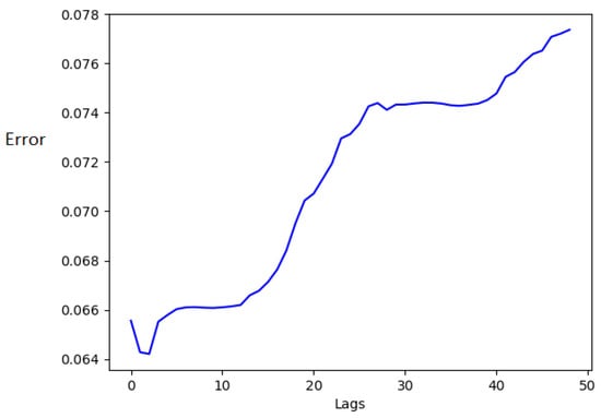 Since most of the models implemented cannot work with time variables, it was decided to split this into four explanatory variables, i.e., year, month, day and hour. Similarly, columns that gather information about past energy production were created. The number of lags selected can be observed in Figure 2. Different values from 1 to 50 were tested to check the error of one of the models, and the optimal number of previous values to take into account were 3. As a consequence, the dataset will have three more columns for .