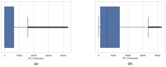 Boxplot of the PV production (a) with null production and (b) removing those 0 Wh samples.