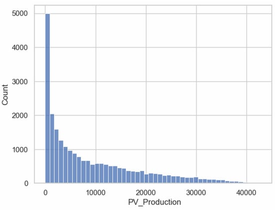 As can be seen from Figure 3a, most of the PV production is gathered within Wh. This is mainly because most of the time it presents null production as a consequence of the sunlight absence. On the other hand, Figure 3b displays the data without taking into consideration the nocturnal period and it can be appreciated how most of the observations, 75%, registered less than 150 kWh. In addition to this, it can be inferred that data do not show a normal distribution. The following histogram (Figure 4) shows how the bulk of the production is close to 0.