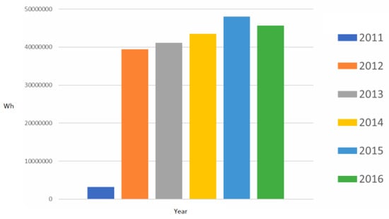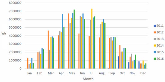 The monthly production is concentrated between May and August, as can be seen in Figure 6. It is worthy of mention that in the summer of 2012, the energy production suffered a notable decrease compared to the rest of the years.