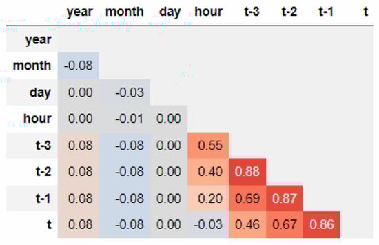 Finally, it is interesting to study the correlation between variables. The more information we have, the better to the chance to improve the prediction of our models. However, when managing a sheer amount of data, some information could turn out to be irrelevant or even noise. Thus, Figure 8 illustrates a strong correlation between the energy production at time and the preceding values, the closest one being the most correlated.