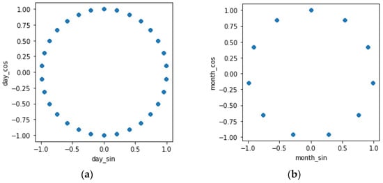 Another key piece in this stage is the proper representation of the data. The main problem with the time-related variables (hour, day, month) is that the values of such variables do not represent their seasonal nature. As an example, the distance between two observations whose months are 1 (January) and 12 (December) would be always 11, although this is not necessarily true as there is only 1 month between them. The solution found for this issue consists of increasing the dimensionality of each variable by means of trigonometric functions. In this way, one may work with cyclical variables that represent the information in a better way, as can be seen in Figure 9.