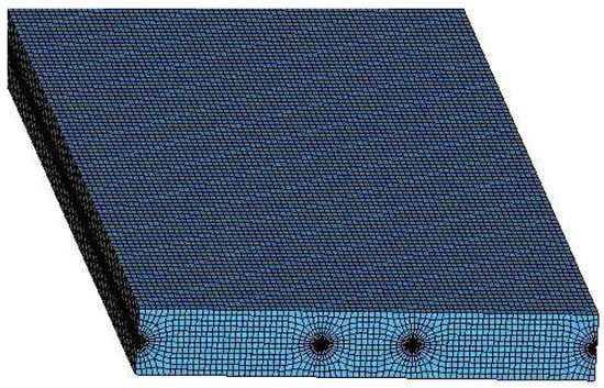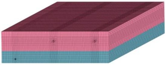 One blast hole and three control holes are arranged as shown in Figure 1. The spacing from the blast hole to each control hole is 4 m, 6 m, and 10 m. The diameter of the blast hole is 90 mm, the charge length of the explosive is 40 m, the stemming is 1 m, and the control hole is 42 m. The model is 10 m wide, 1.5 m thick, and 42 m long, as shown in Figure 2. According to the test on-site, the working face is simplified to a continuous media model, and the type of model unit is Solid164. The other two sides and bottom surfaces applied non-reflective boundary conditions. Both symmetric surfaces of the model applied the normal displacement constraints. The model is simplified by taking the upper part of the whole model according to symmetry to be easy to compute. The simplified model size is 10 m × 75 cm × 42 m.