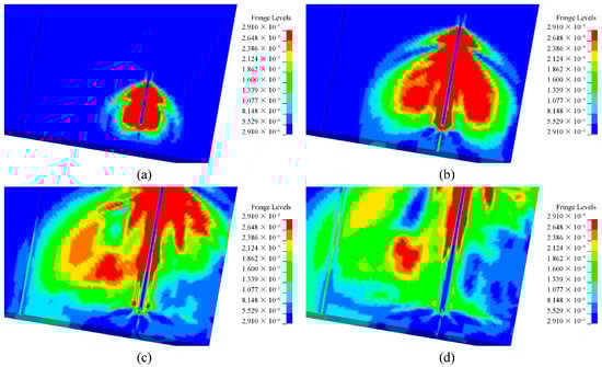 Part zoom-in pictures of dead elements around the blasting hole: (a) 400 μs; (b) 1600 μs; (c) 3000 μs; (d) 3700 μs.