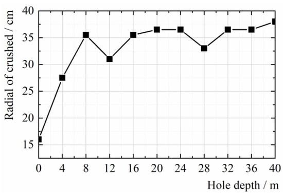 The stress on the coal exceeds a certain value of its yield strength to destroy it. Figure 3 shows the radial failure of the local element along the blast hole at different times. The failure range does not change at 8800 μs after initiation. The final crushing failure range at each location along the hole axis is given in Figure 4. The origin means the initiation point. As shown in Figure 4, the crushing failure range at each point along the blast hole increases sharply from the origin to 8 m. It increases slowly from 8 m to 40 m. The radius of the failure range is approximately equal to 35 cm. It indicates that the failure range at the middle and bottom of the blast hole is larger than that at the hole entrance.