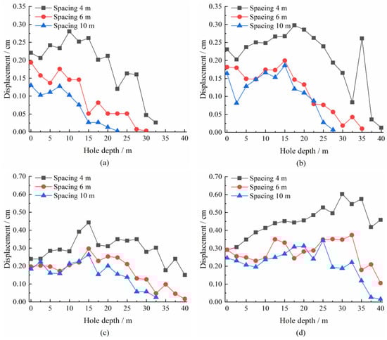 Displacement comparison along the control holes at critical moments after initiation: (a) 6000 μs; (b) 7000 μs; (c) 8000 μs; (d) 9000 μs.