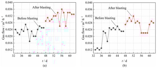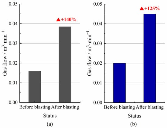 Comparison of average gas flow before and after blast for coal-only and coal-rock media: (a) coal-only media; (b) coal-rock media.