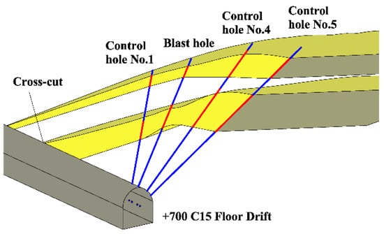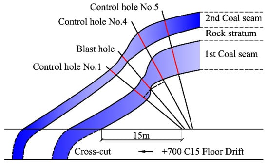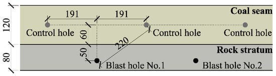 On-site measurement shows that the blast hole traverses the rock stratum, coal seam, rock stratum, and coal seam in that order. The hole length in each seam is 10, 3, 3, and 1.5 m. Blast and control holes Nos. 1, 4, and 5 are coplanar and arranged in a fan design. Their respective angles with the blast hole are 10°, 13°, and 16°. These holes are designed to compare the stress variations caused by different hole spacing. The burden at the entrance of the three control holes is 1.90 m, 2.92 m, and 5.41 m, and that at the bottom of the three ones is 3.22 m, 4.64 m, and 8.77 m. Figure 7 and Figure 8 show the hole layout. It uses the hole-entrance initiation.