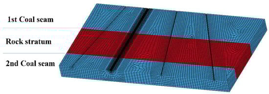 Figure 9 shows the model built according to the actual hole-layout design. The part near the entrance of the blast hole, namely in the first rock stratum, is 10 m long and stemmed, so the model does not contain this rock stratum. The blast holes in the model start at the interface between the stemming and charging, end at the interface between the second coal seam and the third rock stratum, and pass through the first coal seam, the second rock stratum, and the second coal seam in that order. The minimum distance from the boundary on both sides of the model to control holes No. 1 and No. 5 is 1 m. The model is 13.48 m long, 7.5 m wide, and 1 m high. Table 3 shows the mechanical parameters of coal and rock.
