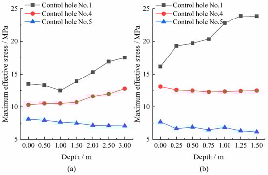 The origins in Figure 11a,b refer to the points of the control hole entering the first and the second coal seam. As shown in Figure 11a, the maximum effective stress increases as control holes No. 1 and 4 are deep into the first coal seam, while that decreases for control hole No. 5 because it is farthest from the blast hole. As shown in Figure 11b, with the distance from the origin increasing, the maximum effective stress of control hole No. 1 increases while No. 4 and No. 5 decrease. Therefore, the stress variation trend along the hole axis varies in the two coal seams. It is more complex than blasting in a single seam.