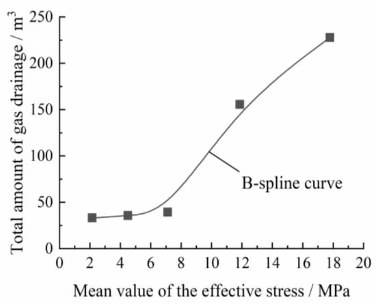 Figure 12 shows the relationship between the total volume of gas drainage and the mean value of the effective stress, which refers to the mean value of the same drainage hole in two coal seams. The gas drainage increases more than three times when the mean value of the effective stress is more than 12 MPa. The total volume of gas drainage is less than 39 m3, with little change when the average effective stress on the coal seam is less than 7.12 MPa.