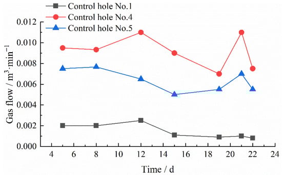 The gas flow of control holes Nos. 1, 4, and 5 are detected after blasting to compare the gas drainage effect of different control holes. Control hole No. 1 is the closest to the blast hole. As shown in Figure 13, the average gas flow of control holes Nos. 1 and 4 is 502% and 331% that of control hole No. 5. Thus, blasting has a much higher effect on the gas drainage rate of control holes No. 1, 4 than No. 5. Hole No. 4 is the critical position to ensure the blasting effect. The effect is remarkable after blasting when the angle between the control hole and the blast hole is 13°, while the spacing at the hole entrances and the hole bottoms is not more than 2.9 m and 4.6 m.