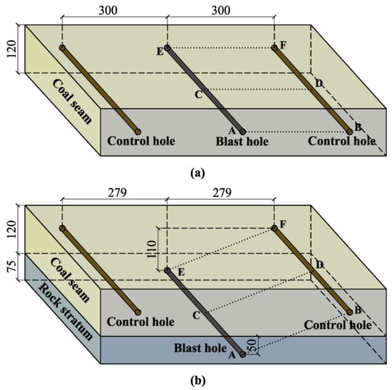 Difference of hole layout for blasting in coal seam or rock stratum: (a) blast hole lying in coal seam; (b) blast hole lying in rock stratum.