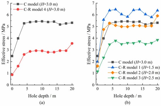 Comparison of effective stress along the axis of control hole for coal model and coal-rock models: (a) C-R model 4 compared with C model; (b) C-R models 1~3 compared with C model.