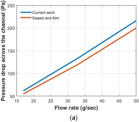 For the purpose of investigating the validity of the current model, the difference between the pressure drop () per channel for the water simulations with tf, Sf and height equaling 1, 1 and 3 mm, respectively, at different flow rates are compared with those obtained from the work of Saeed and Kim [44]. Figure 3a depicts the trends of for the work of Saeed and Kim and the current. As shown in the figure, the ∆P for the current work follows a similar trend to the Saeed and Kim’s work. However, the differences in magnitude between both works range from 8 to 12%. The reason behind the change could be attributed to the fact that the trend of Saeed and Kim corresponds to the averaged values for the total number of channels.