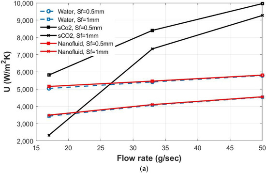 The performance evaluation criterion (PER) is a measure of the thermohydraulic performance of heat sinks. It is calculated using Equation (20), where and are the averaged values of the overall heat transfer coefficient and friction factor, respectively. The can be obtained by averaging the local values of the obtained by solving Equation (21). Figure 9 shows the PEC for all coolants at different flowrates for the geometrical configuration of Hf = 2 mm, tf = 1 mm and Sf = 1 mm. The superiority of the sCO2 performance is evident compared to the versions of the water and nanofluid, which are almost identical. The sCO2 outperforms the water and nanofluid by 53% up to 243% as the flow rate increases from 17 to 50 g/s.
