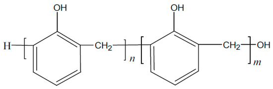 These polymer compounds are mainly obtained by the condensation polymerization of phenol and formaldehyde under alkaline conditions [11]. The molecular structure is mainly linear, containing the hydroxyl methyl active group on the molecular main chain of the polymer. Condensation reactions can occur under alkaline (NaOH), acidic (organic acid), metal oxide, or direct heating conditions from small molecule monomer condensation to macromolecule polymer; the macroscopic performance is from liquid converting into solid. The molecular structure is shown in Figure 2. When the prepolymer with the benzyl alcohol structure on the benzene ring has a phase change, the alcohol hydroxyl group attacks the hydrogen atom on the ortho- or para-position of the phenolic hydroxyl group on the benzene ring, forming a methylene bridge to combine two small molecules and remove a molecule of water [12,13,14].