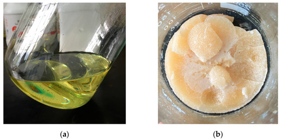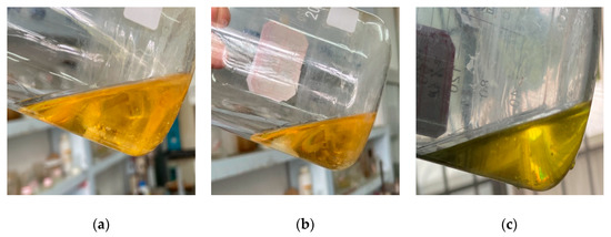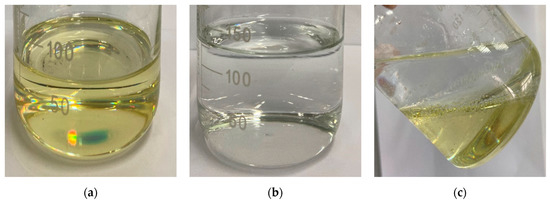 The experimental results are shown in Figure 4a. The viscosity of the PCL was about 200 mPa·s with a density of about 1.15 g/cm3. Figure 4b shows the solid material converted from the PCL under high-temperature conditions (about 80 °C). The cured product had a certain hardness but was brittle. The obtained phase-change liquid was tested for long-term stability. Considering the different seasons and storage environment temperatures, the experimental design was to store the PCL sealed without light for 15 days at 20 °C, 30 °C, and 45 °C to observe whether the liquid properties would change. The test results are shown in Figure 5a–c.