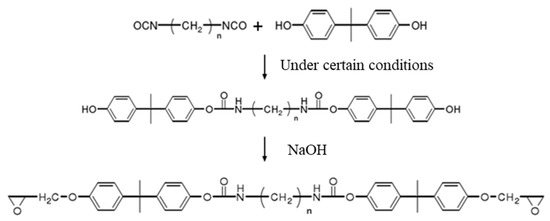 Although there are many kinds of polymers with epoxy groups, most of them are mainly glycidyl ether structures, and the other groups connected by epoxy groups through ether bonds are mainly bisphenol-A [25]. The chemical structure is shown in Figure 3.