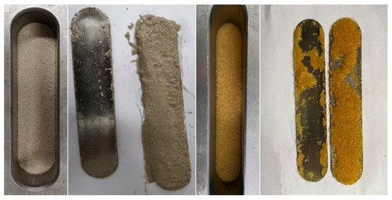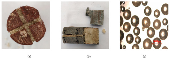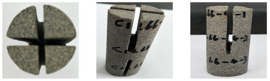 The PCL and NPCL were placed into two liquid tanks, respectively, at a volume ratio of 1:1. The core that was cut to simulate the complex fractures (see Figure 22) was put into the core holder and heated until the temperature rose to 80 °C. Then, the two-phase liquid was displaced into the core at a constant rate and the confining pressure was increased to simulate a fracture closure. After 10 min, the sample was removed to observe the phase-change results and the distribution of the cured products.