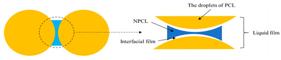 In addition, polymer and solid particles can also stabilize the interfacial film. Polymers can be adsorbed on the two-phase interface by diffusion and migration. Because of their links, each chain can adsorb on the interface to form an adsorption layer, which will make the boundary film thicker and increase the stability of the interfacial film [35]. Solid particles, whose sizes are much smaller than the PCL droplets and can be wetted by the two-phase liquid, are able to adsorb on the interface layer to thicken the interface film and improve the interface strength (see Figure 18).