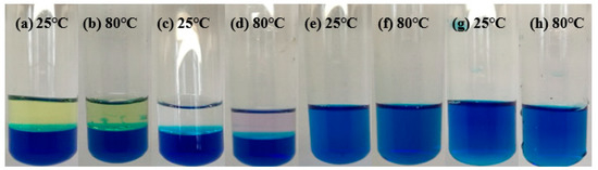 Figure 20a–h show the NPCL (blue liquid) separately mixed with kerosene, diesel oil, and formation water with high or low salinity at different temperatures. The Figure 20a–d are the test results of the NPCL mixed with the kerosene and diesel oil at 25 °C and 80 °C. It can be observed that the interface of the two-phase liquid was clear without miscibility, flocs, and precipitation, which indicates the great compatibility between the NPCL and the crude oil. The Figure 20e–h are the test results of the NPCL mixed with the formation water with high or low salinity at 25 °C and 80 °C. The two kinds of liquid were miscible into each other but no flocs or precipitation were produced, which also proves the great compatibility between the NPCL and the formation water.