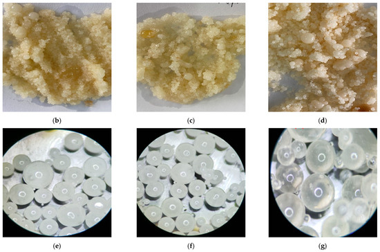 The process and result of the phase change under complex formation conditions: (a) Two-phase liquid mixed with rock powder, crude oil, and formation water; (b) Solid particles cured in 10 MPa; (c) Solid particles cured in 15 MPa; (d) Solid particles cured in 20 MPa; (e) Microstructure of solid particles cured in 10 MPa; (f) Microstructure of solid particles cured in 15 MPa; (g) Microstructure of solid particles cured in 20 MPa.