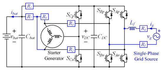 Figure 1 shows the circuit configuration of integrated OBC, which is constructed by installing relays (R1–R7), a filter inductor (Lf), a single-phase grid source, and an additional circuit in the SG with drive inverter. In addition, it is composed of switches of three-leg (SAp, SAn, SBp, SBn, SCp, and SCn), DC-link capacitor (CDC), battery side capacitor (Cbat), and the SG. Although integrated OBC demands the installation of additional components, it realistically decreases the number of components, weight, and volume of PHEV compared with that having the OBC and the SG with drive inverter separately because the volume for IGBT modules, gate drivers, and heatsink used in the integrated OBC is considerably decreased [19,20,21,22,23].