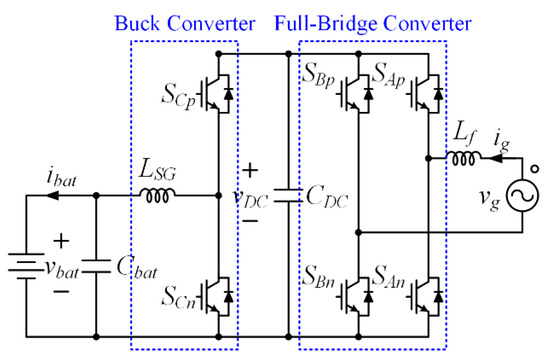 In the full-bridge converter, leg-A and leg-B are operated independently and not only switches of leg-A (SAp and SAn), but also switches of leg-B (SBp and SBn), have complementary switching states, respectively. The duty ratio of them is determined by control of vDC and grid-side current (ig). As a result, the operation of the full-bridge converter makes vDC as DC value from the grid-side voltage (vg) as the AC value, and it is capable of power factor correction (PFC) of the single-phase grid source.
