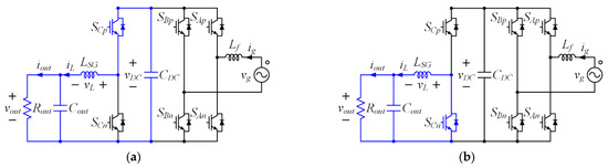 Figure 3 shows the equivalent operation circuit of the buck converter which performs battery charging; however, a resistive load is considered by replacing a battery connected to the buck converter in this paper. It is divided into two different modes. In mode 1, as shown in Figure 3a, SCp, as an upper switch of leg-C, is the ON state and SCn, as a lower switch of leg-C, is the OFF state because they have complementary switching states. Therefore, inductor voltage (vL) is expressed as in (1) by Kirchhoff’s voltage law (KVL) and inductor current (iL) is increased because vL is positive.